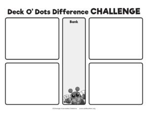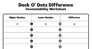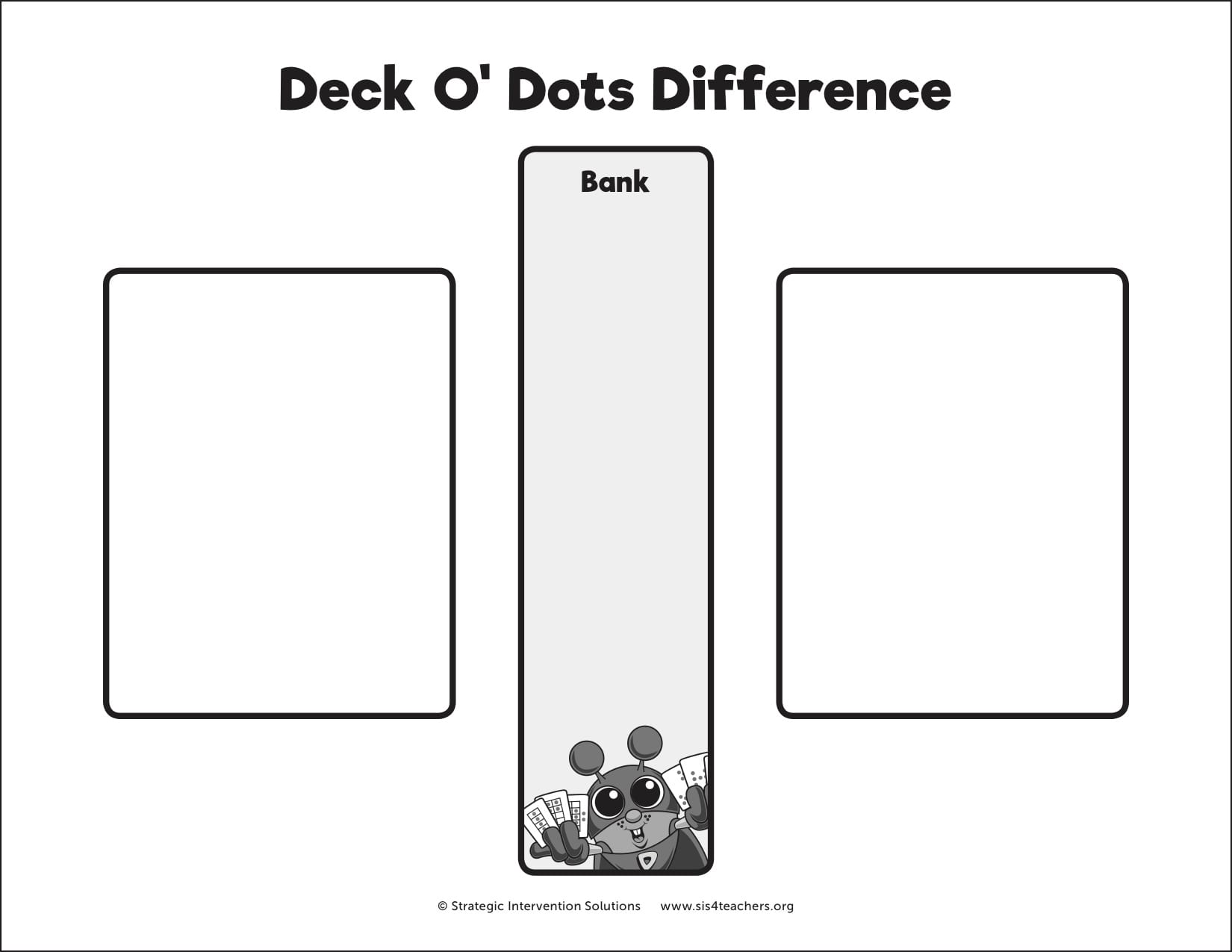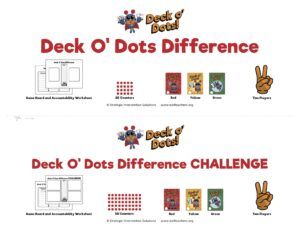 Teachers can print the regular game board on one side of a clear plastic sleeve and have the students play the standard Deck o’ Dot Difference game, where students are flipping one value at a time. Or students could play the basic game on a higher level with larger scatters where they are using the green deck with Dotson’s starred sneakers.