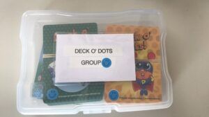 As we‘ve talked about before, one of the biggest challenges or goals is to have differentiation be invisible in your classroom. If we walked into your classroom and the students were playing Deck o’ Dots Difference, it would appear that everybody is playing the same game. However, we’ve hidden the levels based on where kids are in numeracy development. You might see one set of students playing with the higher level deck marked by with Dotson’s starred sneakers, or another group of kids are playing in the yellow deck which is 10-frames. They’re all still working on the same objective it’s just making it more challenging as they go.
