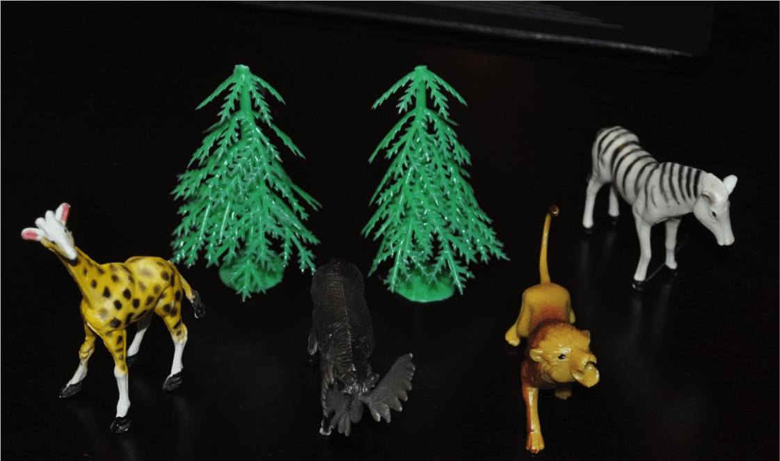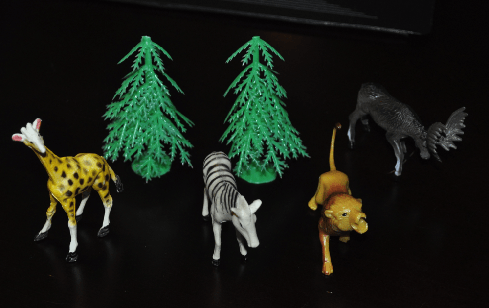 We can take these objects and build a scene that has the objects in a certain order. Let’s say you lay out a zebra, a tree, and a lion, in that order.Let the child look at the scene and see if they can replicate the order in which they see the objects exactly the way you see them. Then, cover the scene and change the position of one of the animals (in our case, the lion) so his head is now pointing away from you. See if the kids can figure out what you changed about the scene.