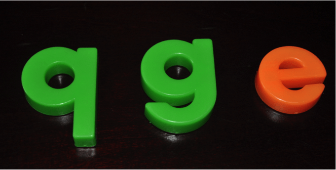 You can also try to do this with letters. Here you can see magnetic letters b, g, e. See if the child can replicate the pattern after seeing it. I can change the order of the letters, making it q g e and seeing if they can fix it. These magnetic letters are really great.