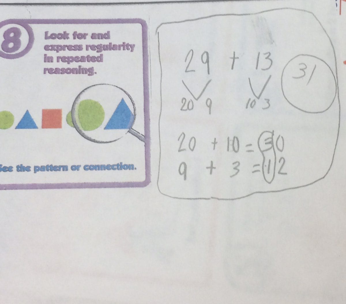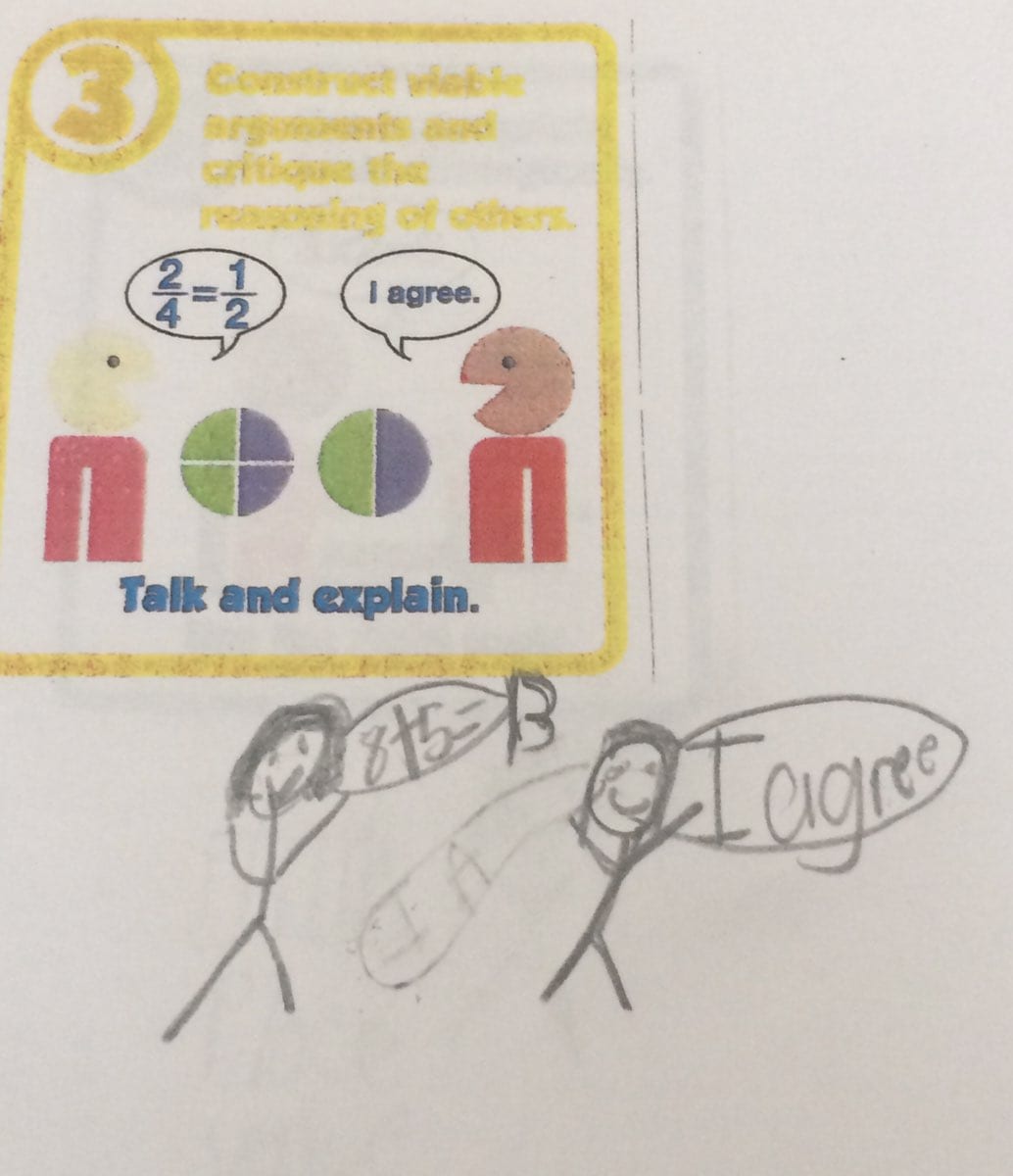 or example, in math practice #7 kids are expected to look for and make use of structures. In their booklet, they could talk about the Counting Buddy, or the ten-frame mats, or an abacus and when they used place value discs for creating a structure that helps them understanding math in a conceptual way. When students are learning math practice eight, they can jot in things like the associative property and the commutative property. This math practice is all about regularity and repeated reasoning, which is what SMP #8 states. We look for those things within an algorithm. How do we relate what we know about math to other things? - Number Talks. Kids can relate to this by number talks, and mathematical practice #3 (construct viable arguments and critique the reasoning of others). Being able to say to another child, “I politely disagree with your answer. I solved it this way,” really shows that the child is using math practice #3 in an appropriate way, which is to be able to construct a viable argument, but not only that, but to be able to critique someone else’s reasoning. I think that’s important too.