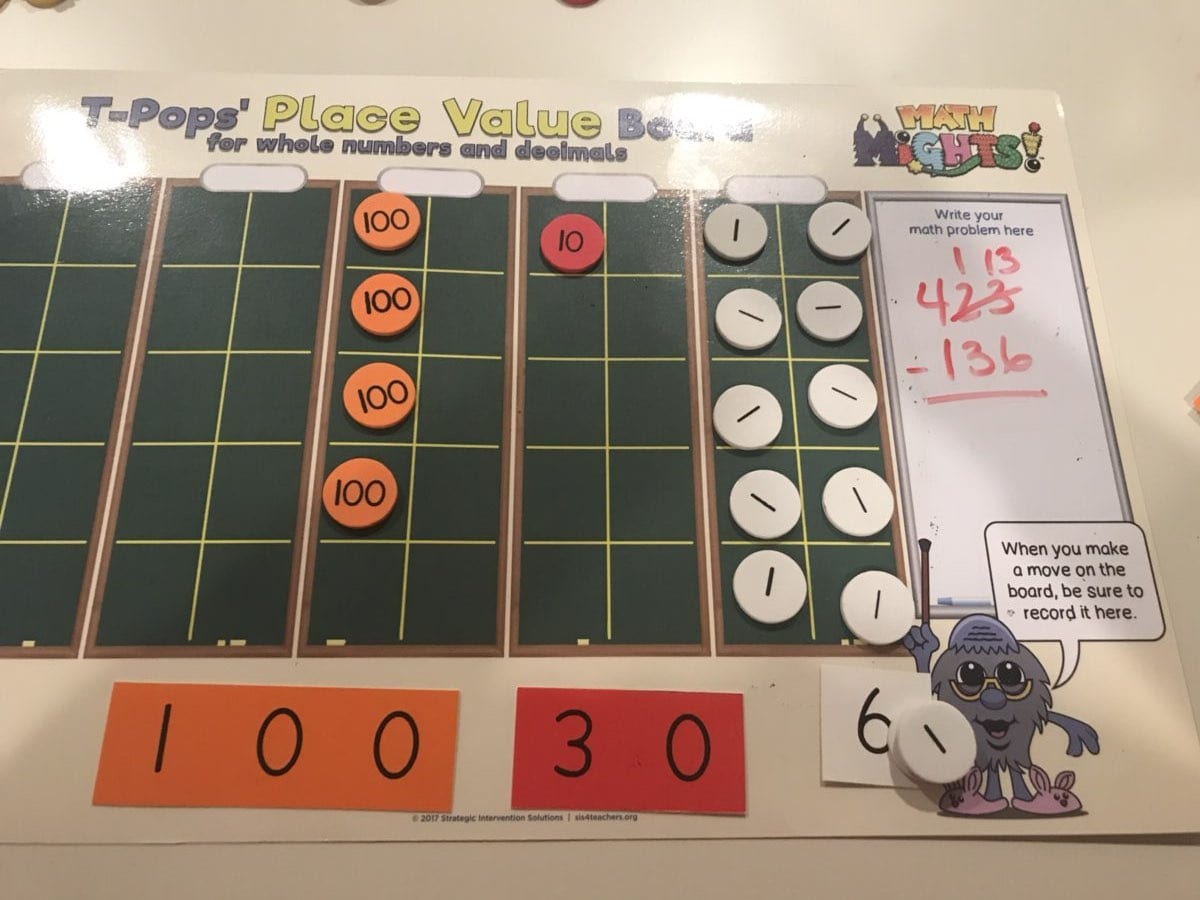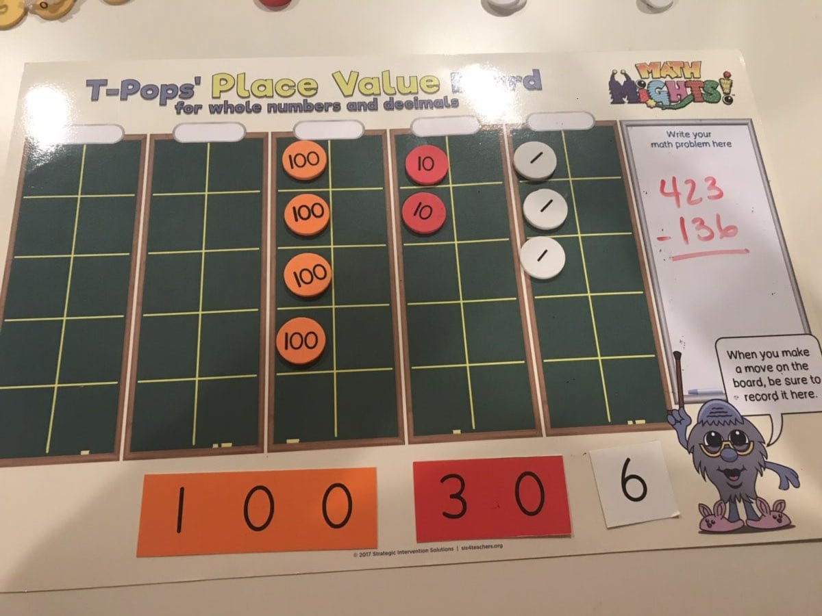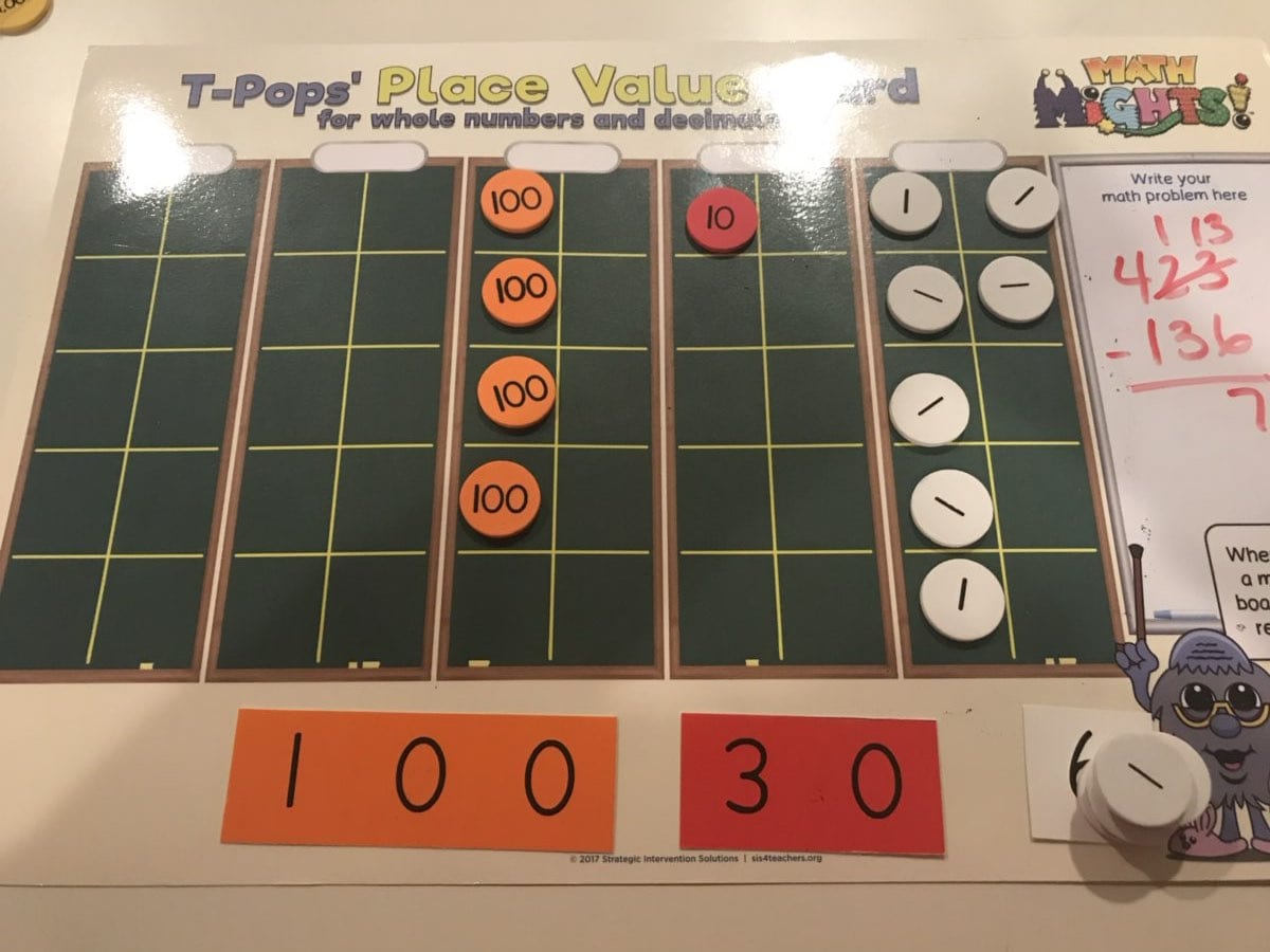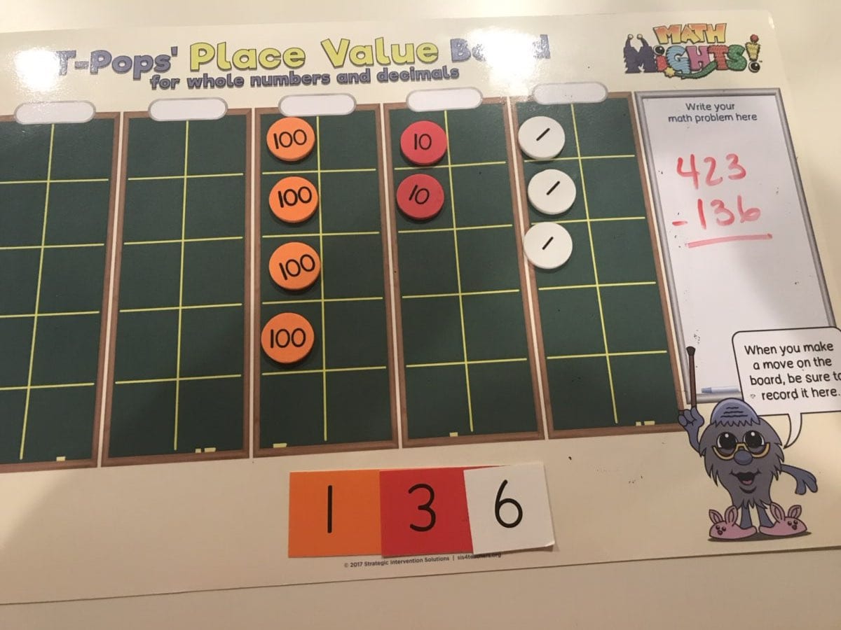 Here’s what we saw. Let’s take the problem 423-136. They built the number 423 on the place value mat with the discs. Knowing they needed to take 136 away from 423, they started in the ones column and realized they couldn’t take six away from three. They needed to regroup/rename the discs so they could actually subtract. Many students took a ten and were going to “cash it in” for ten ones. However, with the three ones already existing in the ones column, they actually only “cashed in” seven. They were left with 7+3=10 instead of 13 ones.