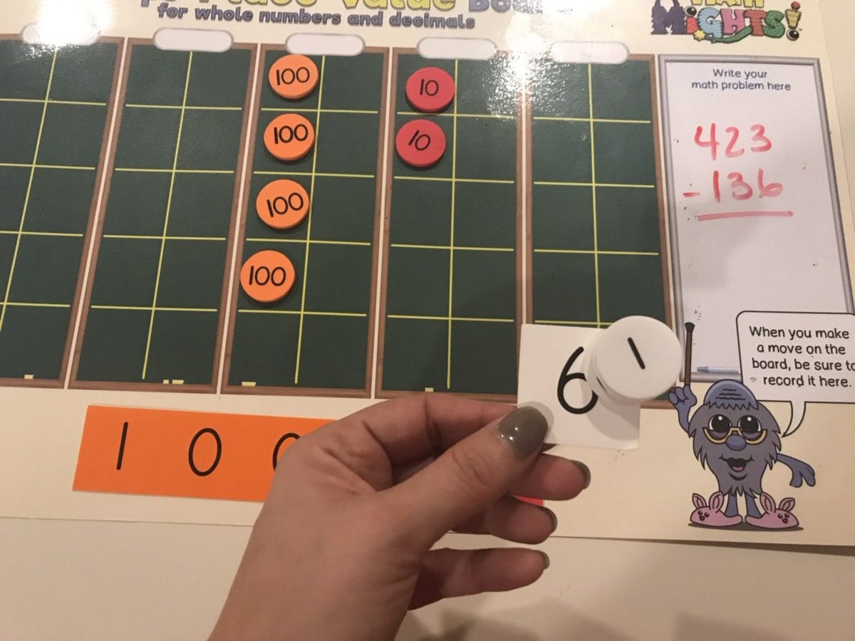 This past week, the third-grade teachers I was going to visit said their students were really struggling with subtraction with regrouping. They were using the manipulatives – the place value mat and the discs – but the kids still weren’t getting it.