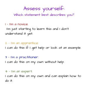 Students can reflect before, during or after the unit, but the goal is to assess how the student feels about where they are with the content. Self-reflection will help them consciously process what they’re learning – Do they know the theme of the unit is? Why we’re learning about it? Where it will apply to your everyday life? How do you feel about applying these skills in your everyday life?