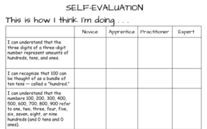 At first, when teachers look at this, they think, “oh, the kids are just going to talk about how they feel about math??” But as we’ve been rolling this out during the school year, the teachers are seeing that this is really a valuable piece. The students are being asked five questions about the standard, and whether they feel like they’re a 1 (novice), 2 (apprentice), 3 (practitioner), 4 (expert) in that area.