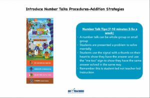 In the upper grades, they still review addition and subtraction strategies, because they still apply to decimals and fractions, but sometimes we included certain number talks that were just on the three ways plus the traditional for multiplication or three or four ways to do division. Sometimes, depending on the standards, we threw in some fraction number talks. But each number talk was outlined in detail in the mini binder so the teachers were really equipped with the resources they needed to support their implementation of this important element of math instruction. We even had reminder boxes sprinkled throughout with tips and tricks and reminders, such as, “Remember, when you’re doing number talks, put your thumb on your heart!”