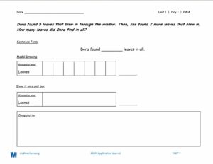 The pages in the journal are coded by problem type and labeled by unit and day. We left flexibility, because we knew teachers might not get to a problem every single day, or they might get to two problems a day. We also scaffolded the problems to where, at the beginning of the year, a second grade student might have three part-whole addition problems, then three part-whole subtraction problems and then a mix of the two to really make sure they understand how to do the model drawings for each. Fastforward to a third grade classroom, they might be doing a mixture of part-whole addition, part-whole subtraction, missing addend, and we might throw in an additive comparison problem to help the kids to be able to come up with a way that they can grab onto that type of a problem.