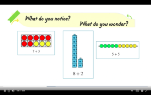 As we start getting into the main part of the lesson, we do a lot with those great phrases: What do you notice? What do you wonder? We show kids three different modalities of numbers put together to match equations. There are 10-frames, but we also have snap-cube towers, as well as the Counting Buddy Jr. that has five beads of one color, and five of another. We start off with what students notice within these three different types of models that they’re seeing. At the end of the day, all of the models equal 10, but they are composed of different numbers – 7 and 3 on the 10-frame, 8 and 2 on the snap-cubes, and 5 and 5 on the Counting Buddy.