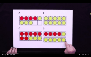 Our “I can” statement is I can fill 10-frames in different ways. We have four different pictures (A, B, C and D) that we’ll show students to ask them which one doesn’t belong. These all are different structures of 10-frames with a different variety of red and yellow counters, some filling the whole 10 frame, some not. Kids will talk about which one doesn’t belong.
