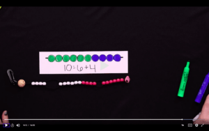 We then flip over to a different tool by using our Counting Buddy Sr., which is one of my favorite tools that you can use to show different parts to numbers. Some people clear it by pushing the beads up to the Counting Buddy’s head. But another option is to put half the beads towards his head (10 beads) and half of the beads towards his feet (10 beads). This way you can pull the beads into the middle to come up with different combinations, which we do in this episode. Then, you can draw in the two parts of the 10.