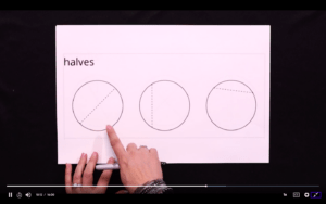 The show begins with two rectangles and the request for them to be partitioned into quarters, or fourths. Then we ask students to shade in 1/4. The girls in the show are thinking of partitioning the rectangles in two different ways, so we talk about the different ways that you could partition a rectangle that would still be equal, but would be able to allow 1/4 to be shaded. We go through the same process with squares – looking at how to partition and shade one half of a square in different ways. The goal is to get kids to really understand why equal parts are important, especially as we look at fair shares.