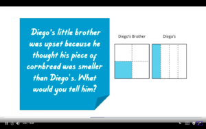 We try to give scenarios to help students understand that, even though the size of the piece looks different, it still could be equivalent or equal to the fraction that we’re talking about. In our scenario, Diego’s dad makes two square pans of cornbread and slices it up for the family. Diego’s little brother feels that his piece is smaller than his brothers’ – his brother has a perfect square, where Diego has a long strip. It’s still divided into fourths, but the size of the piece looks a little bit different.