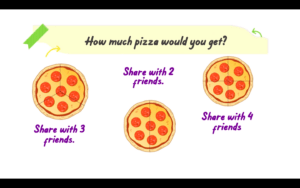 Of course, you can’t really talk about fractions and dividing things equally without dividing up a pizza! If you have a pizza, and you have friends over, how many pieces is each person going to get? Obviously, we have to know how many friends there are. If we were to have a pizza and share it with three friends, with each person getting a slice, they would get ⅓ of the pizza or the pizza would be cut into three equal parts. We would do the same thing if we had four friends coming over. We might cut the pizza into four slices and each friend would get 1/4.