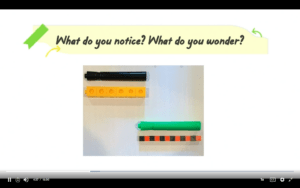 The “I Can” statement is: I can measure length with tools. To open the show, we show snap cube towers of two different lengths and a pencil. We ask our two engagement questions: What do you notice? What do you wonder? This gives students an opportunity to use some of the vocabulary and the words they may have learned before to create descriptive statements comparing the three objects. For example: The purple tower is longer than the yellow tower – or – It looks like the pencil is the same length as the purple tower. As students look at the objects, they’ll arrive at a lot of this vocabulary. We also ask the students to describe the length of the pencil based on the two other comparison objects – a purple cube tower and a yellow cube tower that are different lengths.