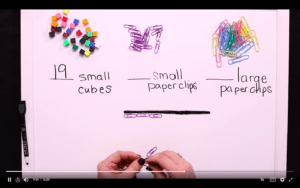 But what about paper clips? This measuring tool is a little more tricky. We talk about how paper clips should be lined up if we’re using them to measure an object. Paper clips move a lot because we don’t have them hooked together, but we can talk about what is the same and what’s different between measuring with paper clips versus snap cubes.