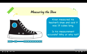 We bring this into the show by talking about three different measurement units – small paper clips, large paper clips, and small or connecting cubes. In our show, we have a shoe that we’re measuring and we set up scenarios which will prompt kids to think about the accuracy of how someone is measuring. Can you mix small cubes with large cubes to measure? That probably isn’t very accurate because they aren’t using the same unit of measurement. This is the big idea we’re trying to get at in this particular show.