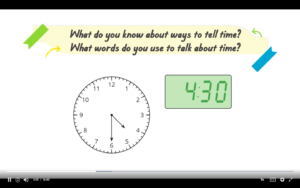 Our “I can” statement is: I can tell time with halves and quarters. We brainstorm what students already know about clocks and telling time. Of course, most students know that you can measure time in minutes and hours. Students will also make note of different kinds of clocks – some are a circle with numbers 1 through 12 around it, but some just show numbers. We will look at the analog clock versus a digital clock, helping kids to make connections and draw parallels. Students might also point out different words they may have learned for time, such as half past for 30 minutes past the hour.