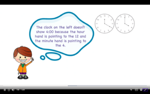 In this show, we address a common error that students might make with time, especially with the hour and minute hand, by looking at two clocks that look really similar. But we help students see why both clocks don’t actually read the same time (4 o’clock). For a time like 4 o’clock, students can see the hour hand needs to ON the hour you’re showing, and the longer minute hand needs to be on the 12. That is pretty straightforward, but as time goes on, and when it’s half past four, for example, the hour hand won’t be directly on the four, but a bit past, in between the four and the five. This is certainly a more difficult concept for second graders to grasp!