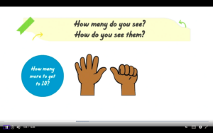 The “I Can” statement is: I can find numbers that make 10 when added to a given number. To start this concept, we look at fingers – in the picture, one hand has five and the other hand has one. We ask questions to get students thinking: How many do you see? How do you see them? How many more will it take to get to 10? Using something like fingers helps students visualize, and fingers are so convenient! They’re never far away (they’re attached to the students’ bodies!) and students can use their fingers to count up to 10. Fingers on hands will help students understand how many more they’ll need to get to 10 as well. Then, we look at different combinations of hands to give students practice figuring out the missing part. If I have eight fingers up, how many fingers are down to complete that 10?