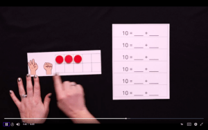 A game called Math Fingers comes next. Students draw a card showing a certain amount using fingers on hands, which they have to create on a 10-frame with one color. With another color, students then have to complete the 10-frame, and then write a number sentence: 10 = ___ + ___. There is also a sentence stem to complete: If I have ____, then I need ___ to make 10.