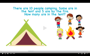 The “I Can” statement is: I can figure out how many cubes are hidden. Kids in this episode are going camping! We set the scene and explain that, when you’re camping, some people might be in the tent and some might hang out by the campfire. In our scenario, 10 people are camping. Some are in the tent, and 5 are by the fire. We ask How many are in the tent?