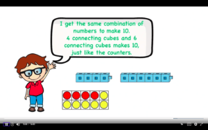 We then talk about how making 10 with connecting cubes is the same as making 10 with a 10-frame. Mrs. Gray shows the two manipulatives side by side, so students can see 4 red and 6 yellow counters in a 10 frame and then see how the same combination looks with 4 snap cubes of one color and 6 of another.