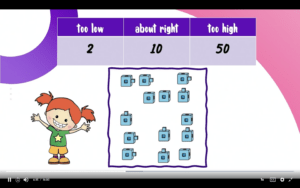 At the beginning of the show, we have a variety of different cubes. This is the first time we’re having Kindergarteners do a little bit of estimation! We want them to figure out what’s too low, about right, or too high. Of course, our students could touch and count the collection of cubes, but we really want them to get the basic idea of what a good guess would be. Guessing two cubes would be “too low,” because we can obviously see there are way more than two cubes. “Too high” for a Kindergartener might be 50 cubes because, even if we were to look at 50 on an abacus, we could see that there are way less than 50. A “just right” guessitmate might be about 10.