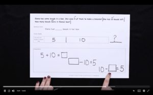 If you heard me say “story problems,” you know what character we’re using in this show – it’s Professor Barble! We are bringing back this concept of a visual model, but in a little less scaffolded manner than we have before. We have different problems that have unknowns in different positions. For example, Elena bought a bag of beads to make a bracelet, she takes out nine beads to make a bracelet. There are 11 beads left in the bag, how many beads were in the bag when Elena bought it? These types of missing addend problems can sometimes be complicated for first graders, just because of how they read. So, we want to make sure that we’re really walking through Professor Barble’s step-by-step process – rewriting our sentence in question form, figuring out who our who and what is, chunking and checking the problem, putting in our bars – all of those great things that we’ve taught in the past so students can understand this problem.