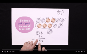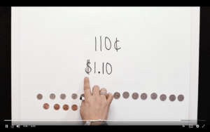 The application at the end of the show presents a child having $1.10 in her pocket. Can we represent that with coins? What about with a paper dollar? The activity is called Handful of Coins, and students are going to do just that! They grab a handful of coins, draw a picture to represent the amount of coins, and then they’re going to add it up to see what their total is.
