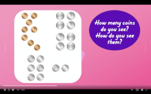 In these two episodes, we get to talk more about coins! The “I Can” Statement is: I can find coin combinations to make 100 cents. We start with a What do you notice? What do you wonder? where we present students with a variety of different coin combinations that they can look at, including a dollar bill, which is new on the show.
