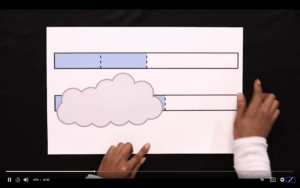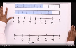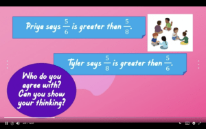 We ask students to look at two fractions strips, but one of them has a cloud covering part of it. We ask What do you notice? What do you wonder? Even though the cloud is covering a portion of the fraction strip, we hope that kids can still compare them by looking at the amount that they see shaded. Then, we ask Are these fractions equivalent? If I was looking at 1/2 and 1/3, are they equivalent? One of our friends says no! If I look at those two fractions on the number line, I can see that they’re not equivalent. We use some of the tools that kids have learned about throughout previous shows to help them determine their answer – area model papers, fraction tiles, or maybe even a number line. Students are also asked to compare 4/6 and 5/6. This one is a bit more simple because of the common denominator, so students can decide if those two fractions are equivalent by looking at how many pieces there are.