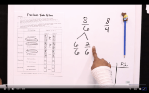 As we move on, we want to make sure kids are careful looking at common numerators, 5/3 or 5/6. Well someone thinks thirds are larger, but they also have to remember that 5/3 is a fraction larger than one (you might call it an improper fraction in your classroom). It’s okay to let kids say improper fractions. In fact, many of the tests will label it like that. But I always ask third, fourth and fifth graders, what is an improper fraction? Their answer is usually when the numerator is larger than the denominator. But, we want to tie it back to number sense. Help your kids get in the habit of calling it a fraction larger than one whenever they see a fraction where the numerator is larger than the denominator. We spend a lot of time on the show looking at this common numerator idea. I think it’s a really great way to get your third graders to think about fractions.