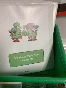 Many of our teachers have created a set of three small, half-inch binders that go into one of the drawers on the Math Salad Bar. The binders are labelled (1, 2, 3), and are filled with any of the games that will be played in the current unit of study. For example, if we have three different games available during a particular unit, there will be one copy of each game in each binder. You could certainly laminate the games, but we recommend using clear plastic sleeves in the binders to save time. In that clear sleeve, students will find everything they need for that game – a game board on card stock, an accountability sheet, etc.