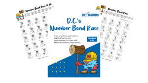 You could also use D.C.’s Number Bond Race, where students see a total and find the missing part. For example, we start with a 16 and I know that there are eight on one spoke, what is the other part? This moves students away from the idea of numeracy, but ultimately toward the goal – which is to develop fluency for combinations and missing addends to 10 in first grade, and then in second grade all the way up in 20.