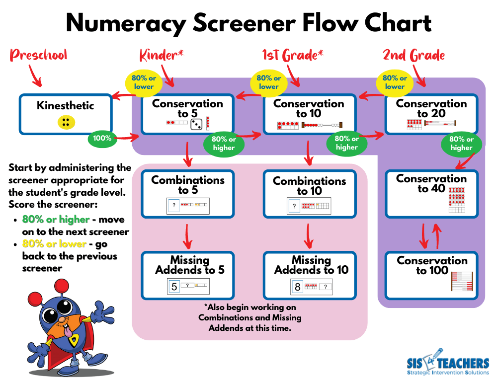 We believe so strongly in screening for numeracy development that we made our screeners into a Google Form, accessible by any school anywhere! It’s as easy as clicking a button, entering your students’ names and then being able to look at data to see where students are struggling. This screener series comes with tutorial videos, and a progression flowchart to guide you through using the 10 individual screeners, scoring guides, and an extensive list of activities that target each level of numeracy development.