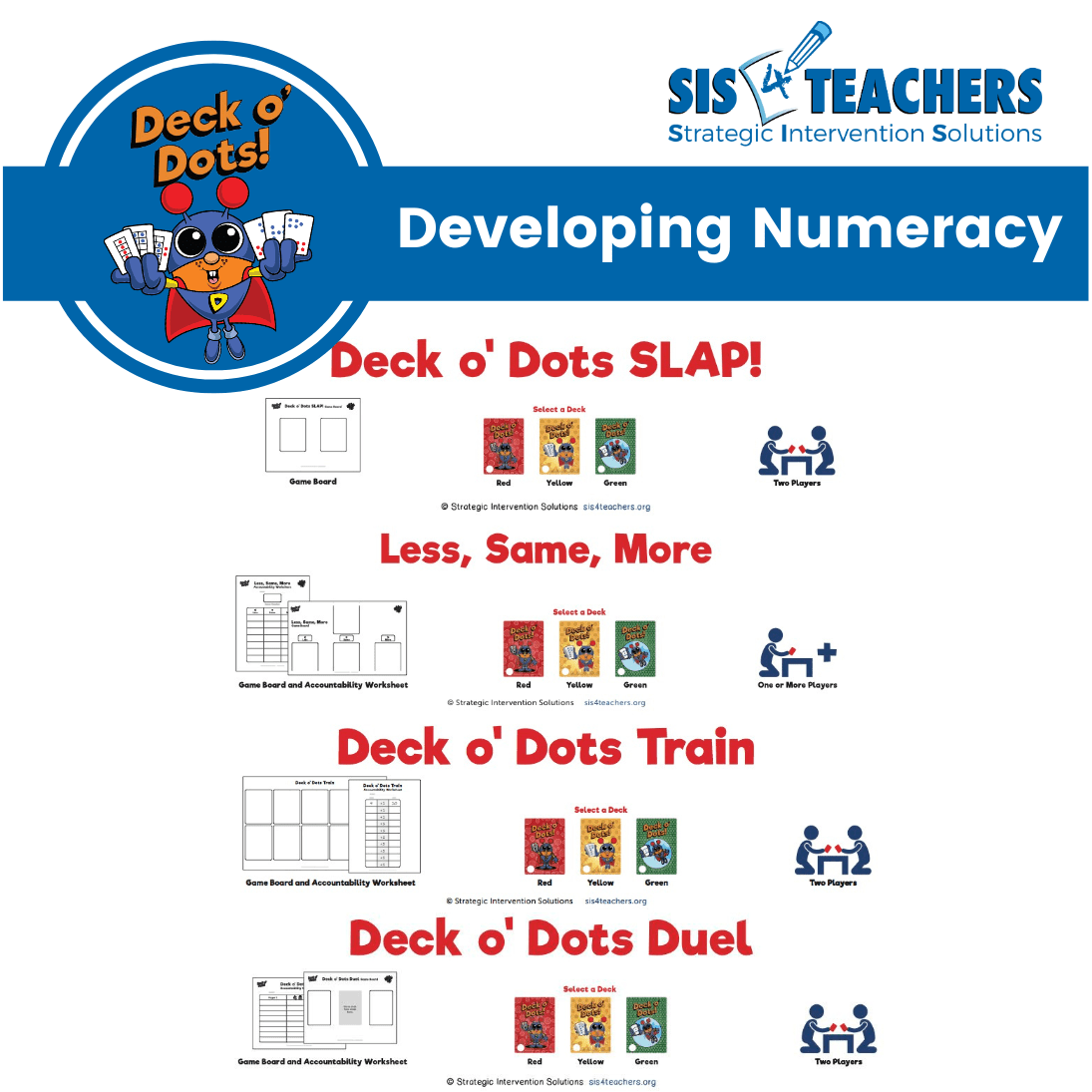 Three decks in one, Deck o’ Dots makes it easy to specifically support students’ numeracy development on all levels.